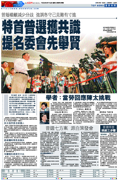 【本報訊】(記者 曾少妍)全面落實普選特區行政長官的討論正式進入新階段。行政長官曾蔭權表示,策略發展委員會管治及政治發展委員會已達成共識,同意應由具廣泛代表性的提名委員會提名特首候選人,再進行全面普選,而下一步將研究落實的具體細節,期望委員會可在明年提交總結報告,並形成共識,令本港政制向前發展。他又呼籲各界應務實地收窄分歧,坦言若人人堅持一己之見,選舉制度將難有寸進。