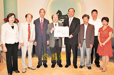 ■潮商互助社理事長吳哲歆(右四)等首長向中聯辦協調部周志榮副部長遞交善款支票。本報記者鄭群 攝