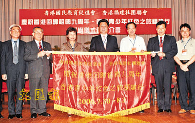 【本報訊】(記者 潘曉平)由香港國民教育促進會、福建社團聯會聯合主辦的慶祝香港回歸9周年-港青少年紅色之旅福建行授旗儀式昨午假小西灣福建中學禮堂隆重舉行,中聯辦副主任李剛、香港民政事務局常任秘書長林鄭月娥應邀出席並主持了授旗儀式。