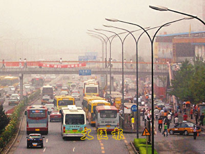 29日,北京、天津、河北、遼寧、山東、河南等地出現有霧天氣。圖為北京中關村大街大霧迷漫,能見度不足千米。 中新社