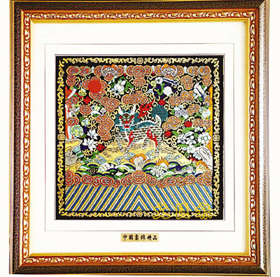麒麟的傳說源於孔子誕生,而《一品麒麟補》有兩層寓義:一是麒麟有「不折生草,不殺生靈」的德性,「腳下空白」象徵麒麟善於以德智服人;二是麒麟送棟樑之子,讚薩馬蘭奇為世界體育事業做出的突出貢獻。富麗堂皇的織錦背後無不滲透著中華民族優秀傳統氣息,充分反映出東方文化特有的審美情趣。