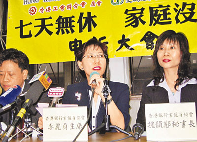 李麗貞又指,不少銀行均表示會因7天服務而增聘人手,卻擔心請人不易。「9月4日便要推出,人手是否能配合五天工作制?」工會又指,大部分市民均不會在周六、日使用銀行服務,更討厭在該兩天接到推銷電話,不少員工均擔心今後難以達成工作指標。在銀行當了20多年後勤工作的歐陽先生表示,對銀行沒有諮詢便擬推行新政策表示失望:「這是我們的切身問題,現在銀行贏了掌聲,可卻苦了我們。不過,如果真係要我更改合約,我也只好無奈接受……保住飯碗最重要。」