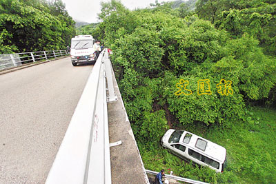 【本報訊】大埔吐露港公路支路昨午發生驚險車禍。一輛7人車報稱避狗失控,狂掃天橋邊防撞欄及水馬後,衝落路旁15米下斜坡,險些翻落天橋下吐露港公路行車線上,司機幸有驚無險未有受傷。