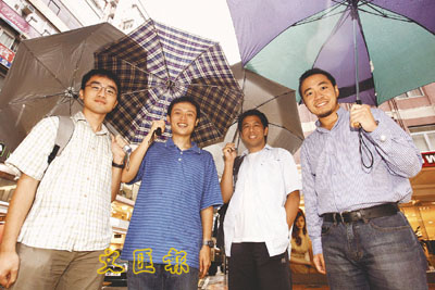 ■匯賢智庫「史丹福四劍俠」,由左至右:施俊輝、蔡宗衡、黃浩倫和陳岳鵬,無懼風雨,決心為港付出一份承擔。 本報記者劉國權 攝
