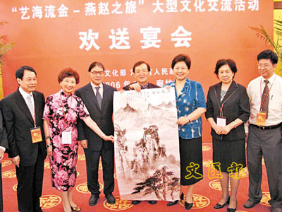 【本報駐河北記者梁利崢廊坊電】來自港澳及內地的近70名嘉賓日前結束了為期一周的「藝海流金-燕趙之旅」,文化部和河北省政府日前假香河「第一城」設宴歡送參加此次活動的嘉賓。國務院港澳辦副主任周波、文化部部長助理丁偉、河北省政府副省長孫士彬等領導出席了宴會並致辭。香港民政事務局局長何志平,香港合唱團協會會長、嘉賓團團長費明儀,全國政協委員、香港知名人士霍震霆,全國人大代表、澳門街坊總會會長吳仕明等港澳及內地嘉賓出席了宴會。