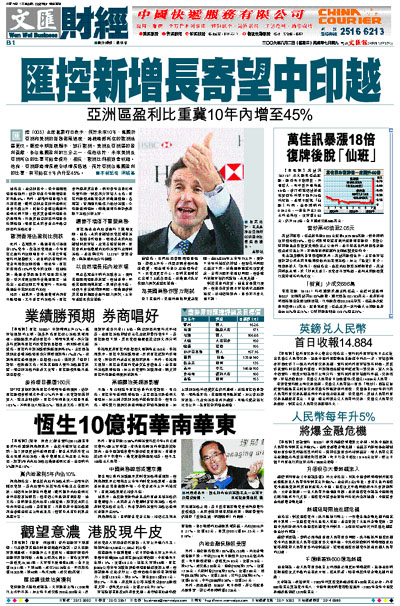 他指出,在亞洲區中,除中國經濟增長強勁外,估計印度今年經濟增長亦可達8%,另外,越南的增長潛力也不容忽視。雖然亞洲及美洲的盈利比重會不斷上升,間接令香港佔集團的盈利比例下跌,但其實香港的增長率仍是很高,只是其他亞洲區的增長率特別強勁,而匯控未來會重新平衡亞洲區的業務比重。