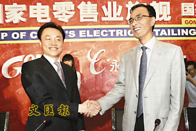 ■黃光裕(左)對蘇寧志在必得,不惜採「王老虎搶親」術,而「過來人」陳曉則落力對蘇寧施現身說法。圖為前不久國美和氣吞併永樂。 路透社