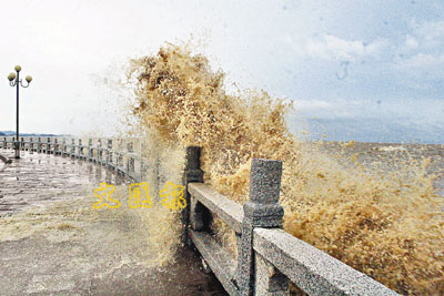 ■「派比安」中心位於珠海市東南偏南方約380公里海面,附近最大風力高達12級,翻起的巨浪直湧上岸。本報記者珠海傳真