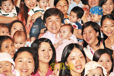 成龍被選為「荷花愛心大使」,他於台上笑言雖然做了爸爸已久,可惜從未湊過小朋友,昨日才知道原來有嬰兒爬行比賽。成龍拍攝《BB計劃》經常要與BB演戲,故對於湊BB亦得心應手。記者見成龍那麼「恨」BB,便提議他叫兒子祖名生一個,大哥聞言即推說現在做爺爺好像快了一點,他笑言:「現在還不想,待他事業有成、收入穩定才算吧。」
