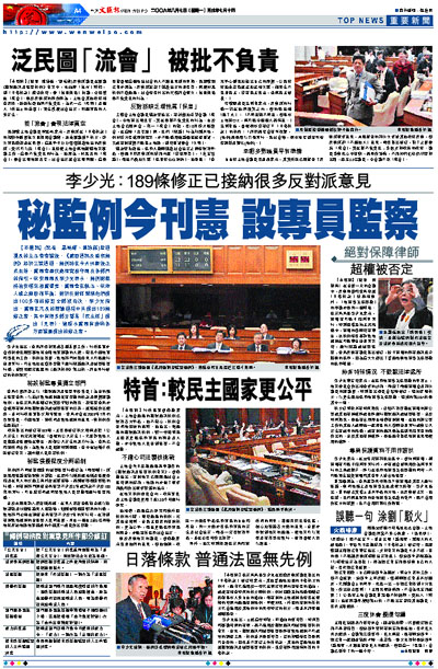 ¡@¡i¥»³ø°T¡j(°OªÌ¡@¿¾å½÷¡B¸µú»ö)¸g¹Lº©ªøªº¥ßªk·|·|ij«á¡A¡mºI¨ú³q°T¤ÎºÊ¹î±ø¨Ò¡n²×©ó¤TŪ³q¹L¡A±ø¨Ò±N¦b¤µ¤Ñ¥Z¾Ë«á¥¿¦¡¥Í®Ä¡A·í§½·|ºÉ§Ö³B²z¹ê°È¦u«h¤Î¦U³¡ªùªº«ü¤Þ¡C«O¦w§½§½ªø§õ¤Ö¥úªí¥Ü¡A±ø¨Ò¹ïºû«ùªv¦wéw¬Û·í«n¡A·í§½·|¦b°õªk¡B«O»Ù¤HÅv¤§¶¡¨ú±o¥¿Å¡Q¹ï©ó¤Ï¹ï¬£ÁnºÙ¥LÌ´£¥X100¦h¶µªº×q¥þ³¡³Q§_¨M¡A§õ¤Ö¥ú«ü¥X¡A·í§½¦b¤¾ªøªºÅG½×¹Lµ{¤¤¦@´£¥X189±ø×¥¿®×¡A¨ä¤¤¦³«Ü¦h³¡¤À³£¬O¡u¥Á¥D¬£¡v´£¥X¡]¨£ªí¡^¡A³oÅã¥Ü·í§½¦³±µ¯Ç¦U¤è±Ä³û´£¥Xªº×¥¿®×¡C