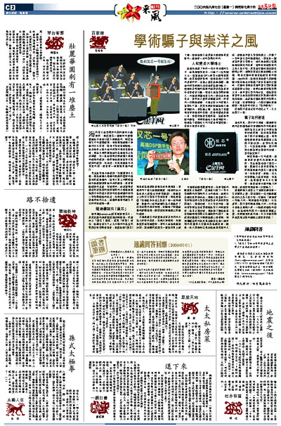 海外華人在學術界行騙的醜聞不斷傳來。關於漢芯一號醜聞的後續報道似乎是最引起人們關注的。對於這個案子的後續處理,先是撤銷造假人陳進的交大教授、微電子學院院長職務,接著是停止給予他的所謂的項目資助等等,現在又傳來撤銷他的全國優秀工作者稱號。我一直在等待著對造假人陳進的處理和處罰,等來等去還是這些不算處罰的處罰。我相信,如果陳進是中共黨員的話,還會有一條撤銷黨籍的處分。