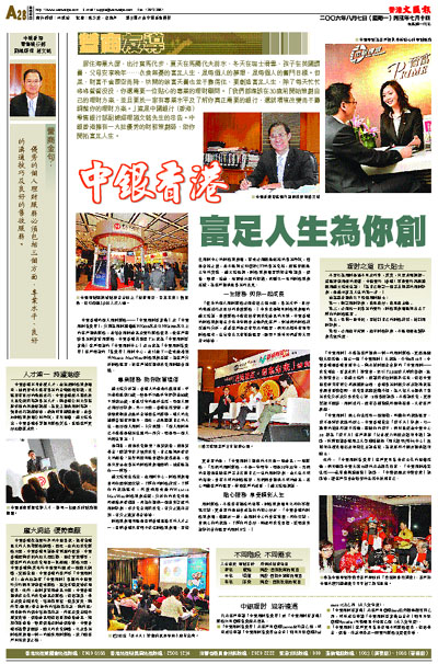 居住海景大屋,出行寶馬代步,夏天在馬爾代夫游水,冬天在瑞士滑雪,孩子在英國讀書,父母安享晚年……衣食無憂的富足人生,是每個人的夢想,是每個人的奮鬥目標。但是,財富不會憑空而降,坊間的致富天書也並不靠得住,要創造富足人生,除了每天忙忙碌碌營營役役,你還需要一位貼心的專業的理財顧問。「我們都應該在30歲前開始策劃自己的理財方案,並且要找一家有專業水平及了解你真正需要的銀行,還就環境改變而不斷調整你的理財方案。」這是中國銀行(香港)零售銀行部副總經理趙文銘先生的忠告。中銀香港擁有一大批優秀的財務策劃師,助你開拓富足人生。