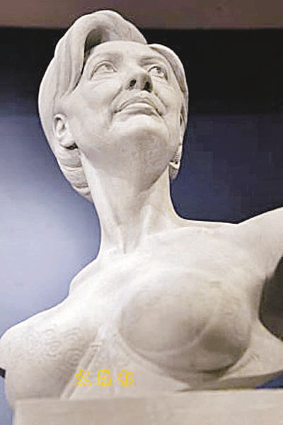 美國前第一夫人希拉莉的性感雕塑昨日於紐約博物館展出。製作雕塑的美國藝術家愛德華玆稱,這個半身雕塑僅穿著胸圍,目的是要捕捉希拉莉的女性特質,雕塑流露著「淡然的總統微笑」,而穿著胸圍的性感設計是為了表達出「沒有掩飾」,論到雕塑眼角的皺紋。他說:「我不想給她整容,或改變她的真實年齡。」 ■路透社