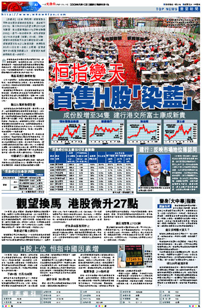 【本報訊】(記者 周紹基)恆指服務公司昨宣布更改恆指成份股組合,建設銀行(0939)、港交所(0388)及富士康(2038)成為藍籌,換出德昌電機(0179)及聯想集團(0992)。建行一如市場所料,成為恆指面世37年來的首隻「染藍」的H股;同時,恆指的成份股破天荒由33隻增加至34隻,恆指編算方法也分三階段改變,新調整將於9月11日生效。市場人士預期,隨著恆指中的H股數目繼續上升,恆指與內地經濟關係將進一步密切。