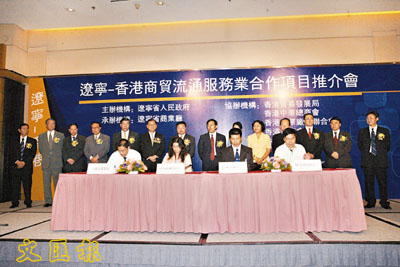 ■遼寧.香港商貿流通服務業合作項目推介會在港舉行,班尼路集團助理總經理施麗旋(前排左二)與大連市商業局現代流通發展處處長張敏祥(前排左一)簽約。 本報記者張偉民 攝