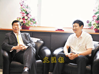 ■阜新市代市長潘利國(右)訪問本報,與本報總經理仇學忠親切交談。