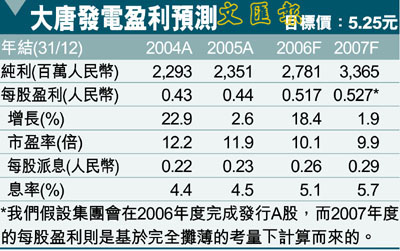 我們認為其經營環境於2006年下半年度將會持續穩定,因煤價及發電廠的運行時數相對平穩。基於其略較預期為佳的營運數據,我們分別調高2006年度的盈利4.7%及2007年度的盈利1.1%。然而,與其同業比較後,我們維持目標價為5.25元(昨收5.04元),以反映10倍的2007年預期市盈率,評級為「持有」。