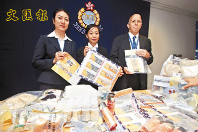 ■商業罪案調查科署理警司郭麗嫻偵緝總督察(中)展示行動中檢獲的大批證物,包括日用品等。本報記者蔣焯文 攝