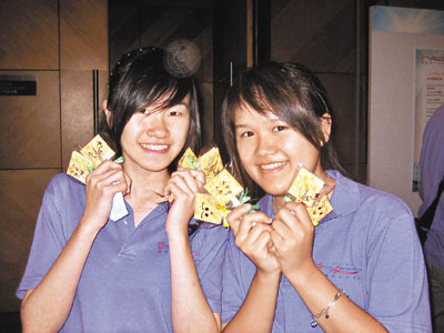 ■廖永嘉(左)及梁蒹葭(右)利用麥芽糖餅,推廣本港的「好客文化」,加深遊客對香港的印象。 實習記者譚靜雯 攝