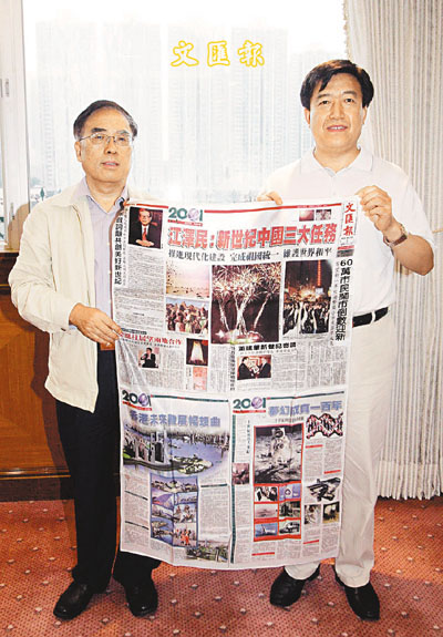 來港招商的遼寧省撫順市市長劉強(右)一行,於本月10日訪問本報。圖為本報副社長潘一黎向劉強市長贈送本報香港回歸紀念版的絲製珍藏版。本報記者曾慶威 攝
