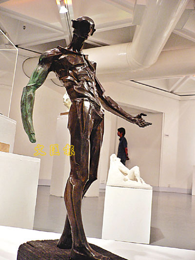 展出作品中,「Troy」(木馬屠城)是一個上身馬、下身為坦克車帶的銅像,古典中帶點科幻感。「車帶來自我成長的記憶,是卡通片高達中的太空坦克。」另一作品「Struggle」(爭執),則取材自19世紀畫家德拉克洛瓦(Delacroix)筆下的獵獅徒,再配以自家設計的針頭人。