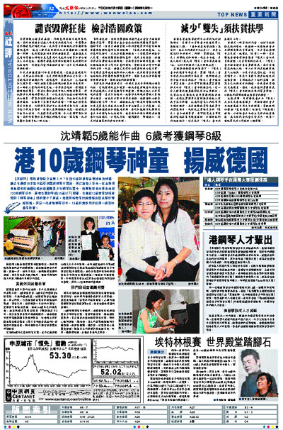 【本報訊】誰說香港缺少音樂人才?年僅10歲的香港音樂神童沈靖韜,繼去年揚威日本第六屆亞洲蕭邦鋼琴大賽後,再次為港人爭光。在音樂界享負盛名的德國埃特林根國際青少年鋼琴比賽中,他擊敗來自世界各地近120名鋼琴好手,勇奪比賽的甲組(15歲以下)冠軍,比曾在12歲奪得該項桂冠的「鋼琴神童」郎朗還小了兩歲。他更同時奪得巴倫賴特出版社原作譜特別獎。而另一位香港鋼琴好手、13歲的黃蔚然亦在同一組別中獲得季軍。
