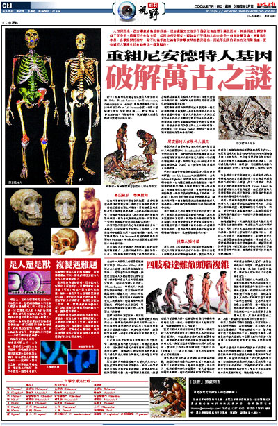 近日,德國的萊比錫普朗克演化人類學研究所(Max Planck Institute for Evolutionary Anthropology in Leipzig)宣佈與美國康乃狄克州的科技公司454 Life Sciences合作,重組一種絕跡3萬年的史前人類—尼安德特人(Neanderthal)的基因序列,試圖填補人類進化歷程中幾處空白的片段。