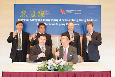 ■諾富特東薈城酒店及甘泉香港航空管理層於簽約儀式後舉杯慶祝