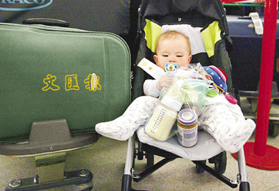 ■警方相信有一對夫婦企圖將致命化學品混入嬰兒奶中,企圖瞞過安全檢查,以完成恐襲使命。圖為希斯羅機場本月10日,一個嬰兒坐在嬰兒車上,奶樽放在透明膠袋內。 美聯社