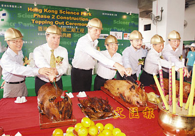 工商及科技局局長王永平偕同香港科技園管理層,昨日出席香港科技園二期平頂儀式。預計首八座大樓將於明年分階段完成,整個科技園二期完成後,可提供22萬平方米總樓面。
