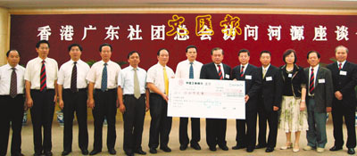■梁偉發書記(右七)、吳銳成市長(右八)接受余國春(右六)、林光如(右五)等廣東社團總會首長捐贈善款支票。 本報記者鄭群 攝