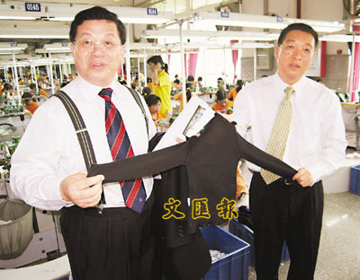 ■吳惠權副團長(右)向林光如團長介紹公司出品的冷衫。