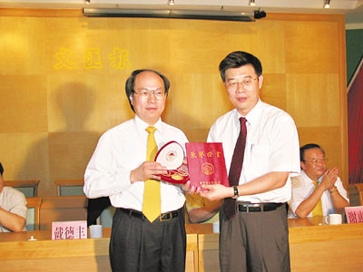■普寧市委書記柯群堅(右)頒發「鐵山蘭花獎」予香港四洲集團主席戴德豐博士(左)。