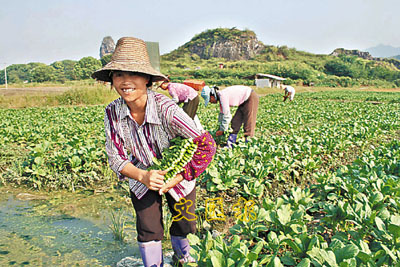 ■韶關菜連續三年被評為冠軍菜與當地氣候環境條件分不開。圖為始興縣的港資合利菜場菜農在收割。本報記者徐超 攝