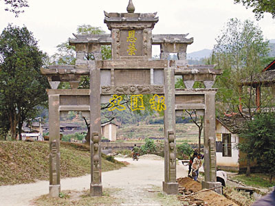 ■村口佇立著光緒皇帝恩准培田人吳拔禎建造的「恩榮」牌坊。