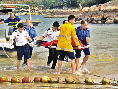 ■遭快艇撞死的泳客,被抬回沙灘搶救。本報記者黃信華 攝