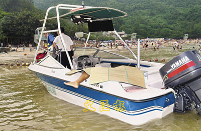 ■被撞死的泳客,由肇事快艇載返沙灘。本報記者黃信華 攝