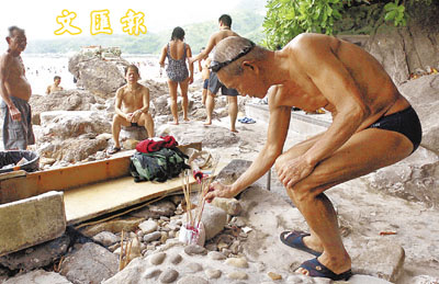■一名與劉伯相識,同在清水灣二灘游水多年的長者,在下水前為劉伯上香。