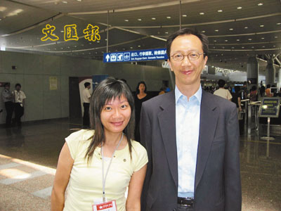 【本報實習記者陳慧玲20日電】「嘩!嘩!嘩!竟然讓我們遇上他。」2006「未來之星—中國國情教育培訓班」的學員們從香港出發,在登上飛機後,都不約而同地發出驚喜之聲。原來他們碰上前財政司司長梁錦松,真是有緣千里能相會。就在相遇的一刻,有同學抓緊機會與梁錦松交談,梁錦松友善地向同學們送上祝福,祝願同學們好好學習國情,他非常支持國情教育班,認為這可給同學提供學習國情的機會。