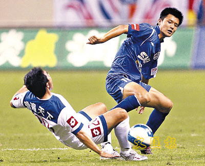 ■申花球員于濤(右)與瀋陽金德球員拚搶。 新華社