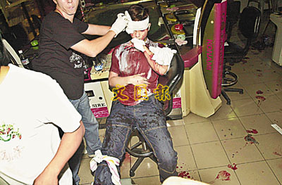 觀塘發生恐怖血案。昨晚10時許,男子鍾×光(28歲)在仁愛圍一間遊戲機中心打機期間,突有4名年約20至30歲、戴韝f罩的男子衝入,向鍾×光揮刀狂斬,他走避不及,頭、背、膊及大腿中刀重傷,恍如血人;兇徒傷人後四散逃去,由到場救護員包紮送院,警員在現場檢獲一把懷疑傷人兇刀,正追尋起因。