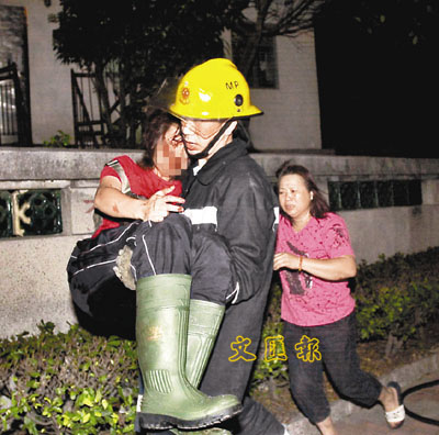 ■貨車上女少東滿面披血,由消防員抱往救護車。