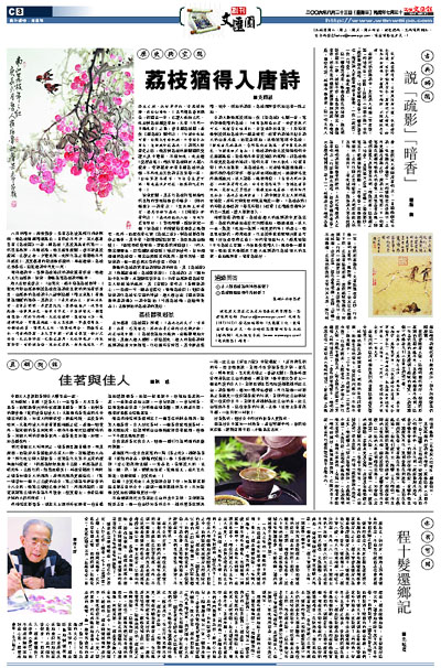 徐夤更絕,其善以荔枝抒寫閒適淡然意境的筆法怕是古今獨步。《郊村獨遊》一詩有云:「驚魚擲上綠荷芰,棲鳥啄餘紅荔枝。」《鷓鴣》亦有句云:「荔枝初熟無人際,啄破紅苞墜野田。」憑此兩聯,給徐夤冠一個「徐荔枝」的雅號怕也是當之無愧吧。此外,他還作有七律《荔枝二首》,對荔枝極盡描摹之能事,其中有「龍綃殼綻紅紋粟,魚目珠涵白膜漿」、「靈鴉啄破瓊津滴,寶器盛來蚌腹圓」、「何人刺出猩猩血,深染羅紋遍殼鮮」等狀物佳句,恰如層層剝開荔枝殼,現出白潤鮮美的果肉,饞煞我等。讀徐夤詩,做一回古典文學的食客,妙哉!