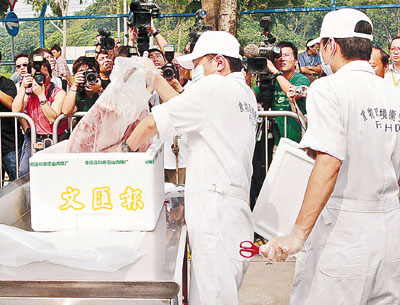21日下午,深圳市南山肉聯廠開始對這批活豬進行屠宰加工,深圳檢驗檢疫局實施駐廠獸醫制度,駐廠獸醫對供宰活豬的驗收、屠宰加工、儲存、運輸等全過程進行實時監督檢查,並實施裝運前的監裝與現場鉛封,以及供港冰鮮豬肉產品的抽樣送檢,確保加工廠各項有效安全衛生質量控制體系的正常運行。