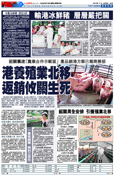 本港養殖業自願交回農場經營牌後,將生產工序轉到內地,已成為業者重獲生機甚至壯大發展的嶄新出路。有退牌港商已率先於數年前在內地租地建房,按照香港的標準和需要再建養殖業,準備大展拳腳。但北上重振的關鍵,還在於他們在內地生產的生豬、肉雞能否順利返銷到香港?據權威人士透露,經粵港兩地政府和香港業界的共同努力,韶關方面已為設立「粵港農業合作示範區」作好一切準備,而本港業者的產品返銷香港的方案,也已由粵方正式向國家商務部報批。 ■本報珠三角記者羅愛文、藺廣凱、徐超廣州23日電