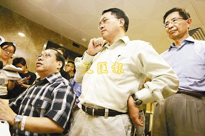 ■李柱銘(右一)與李永達(右二)陪同何俊仁在瑪麗醫院舉行記者會。 本報記者高仲明 攝