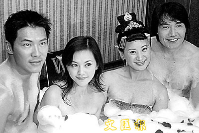 台視為宣傳連續劇《神機妙算劉伯溫》,24日出動演員簡沛恩(左二)、陳亞蘭(右二)等泡浴造勢。 中央社