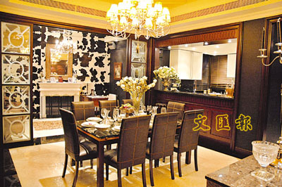 在大型吊燈及各項裝飾映襯下,盡現典雅華麗的飯廳格局;單位更巧妙地將飯廳後方設計成小型客廳,配以歐陸式「火爐」設計,招待客人極盡體面。