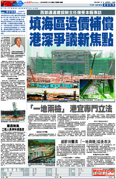 【本報珠三角新聞中心記者熊君慧深圳26日電】連接港深的西部通道口岸土建工程已經完成3成,年底完工。待全國人大常委會作出授權決定後,香港將採用租賃的方式從深圳有償取得土地使用權。本報獲得的獨家消息透露,目前,深港西部通道口岸是由深方填海而成,且實際填海面積遠遠大於口岸區面積,填海區造價費用如何補償支付,成為深港雙方在租賃口岸區問題上較大的爭論焦點。