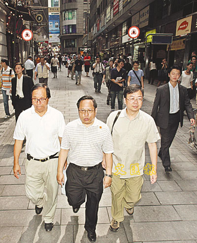 ■何俊仁昨上街除了有黨友陪伴,警方亦派出兩位便衣帥哥(後左二與後右二)「護駕」。本報記者曾慶威 攝